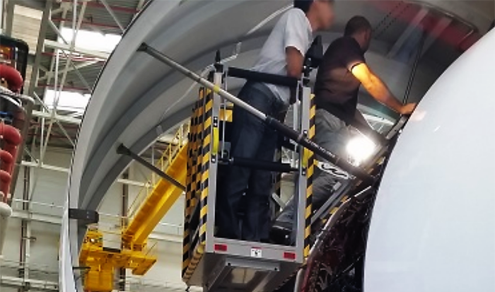 Niewątpliwą zaletą podnośnika Manitou 90V’Air jest jego zwarta budowa oraz specjalnie zaprojektowane, regulowane w kilku poziomach odkładane półki, które umożliwiają mechanikowi komfortową pracę ponad silnikami czy osłonami komponentów. Urządzenie doposażone jest w zestaw czujników zbliżeniowych, co daje gwarancję uniknięcia kolizji z elementami konstrukcji samolotu.