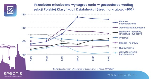 Na 2019 r. Spectis prognozuje wzrost średniej płacy w budownictwie ok. 6%, czyli w tempie podobnym jak dla całej gospodarki. Na tle innych sektorów wynagrodzenia w budownictwie pozostaną więc stosunkowo niskie. Trend taki potwierdza także analiza trendów długookresowych w polskiej gospodarce, w której sektory o dużym udziale prac manualnych plasują się w dolnej skali poziomu wynagrodzeń.