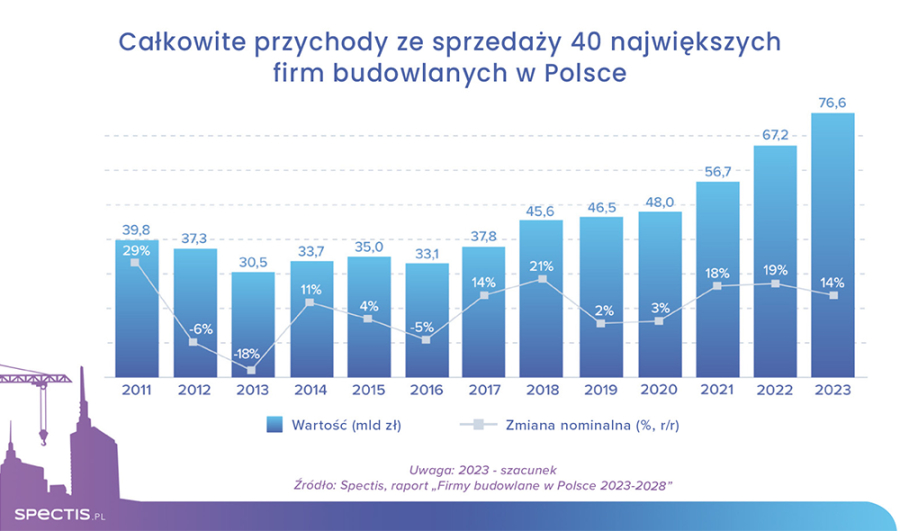Rok 2023 był trzecim z rzędu z dwucyfrowym nominalnym wzrostem przychodów grupy 40 największych podmiotów budowlanych działających w Polsce, co w dużej mierze było rezultatem ogólnego wzrostu kosztów budowy. Dla dalszego rozwoju grupy największych firm budowlanych konieczne jest szybkie uruchomienie finansowania unijnego dla Polski, tj. całości dostępnych środków z Krajowego Programu Odbudowy oraz budżetu w ramach polityki spójności na lata 2021-2027. Jak wynika z najnowszego raportu firmy badawczej Spectis zatytułowanego „Firmy budowlane w Polsce 2023-2028”, łączne przychody 40 wiodących grup budowlanych w 2022 r. wyniosły 67 mld zł, co stanowiło 30% przychodów całego sektora średnich i dużych firm budowlanych.